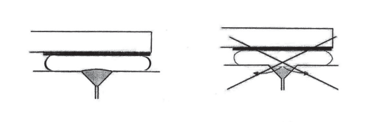 由于施工條件或其它方面的原因 , 地面的伸縮縫往往不可避免 , 在處理伸縮縫時填充材料的肖氏硬度應為 80?或以上 ,可以抵抗 5bar?的壓力,如用 Bostik FC2640?或是類似的材料來修補,為了使處理后的伸縮縫能夠承受巨大的壓力,并且使伸縮縫的棱邊不被損壞,應將伸縮縫的棱邊設計成 900?角(如圖四)。為了減少伸縮縫處的空氣消耗量,應對這些地方填充成略微向外的凸拱形(如圖五)。不允許表面呈凹拱形,原因是氣墊無法緊貼在凹拱形的表面上(如圖六)