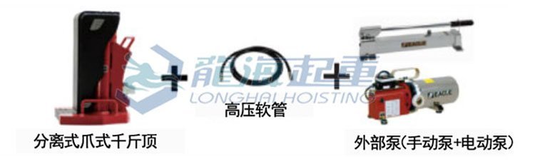 ▲鷹牌遙控趾式千斤頂通過高壓軟管與外部泵連接,
