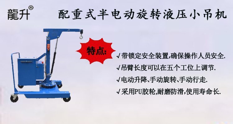 配重式半電動(dòng)旋轉(zhuǎn)液壓小吊機(jī)也叫配重式半電動(dòng)旋轉(zhuǎn)單臂吊,屬于一款通過電源驅(qū)動(dòng)實(shí)現(xiàn)升降功能的小吊機(jī),懸臂伸縮長(zhǎng)度5工位可調(diào).載荷在150kg-550kg可滿足不同載荷的不同工作范圍內(nèi)的使用要求,靈活性高.