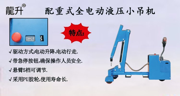 配重式全電動(dòng)液壓小吊機(jī)通過電動(dòng)升降,電動(dòng)行走.無需人力推拉,非常省力;帶有剎車裝置(急停按鍵),安全性高!是我廠研制開發(fā)了電動(dòng)系列的平衡配重式小吊機(jī),它具有結(jié)構(gòu)合理,操作方便,外形美觀,移動(dòng)靈活,吊裝平穩(wěn),工作安全可靠等特點(diǎn).